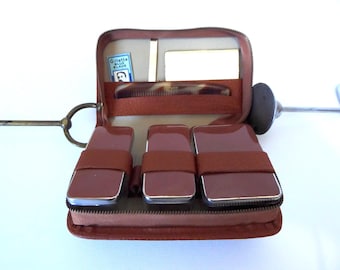 Tailorform knitting needle set and plastic case. Needle set with A.Bruneau yarn. Needle set and storage box, 1970.