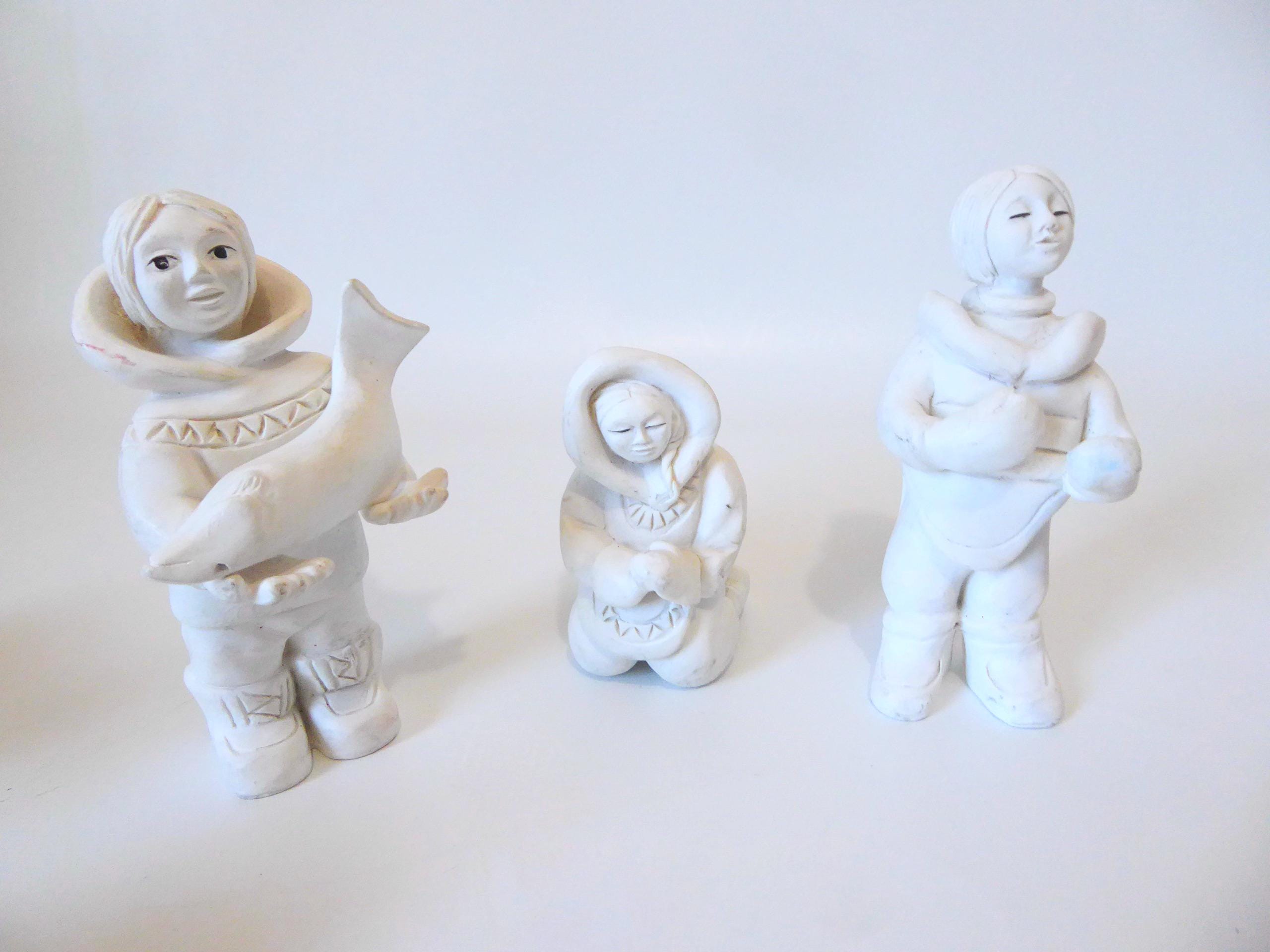 Set of 10 sculptures representing an Inuit family, a penguin, a polar bear and a fish.